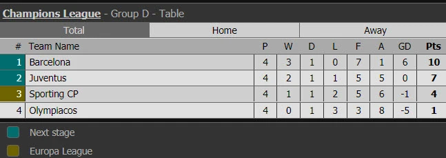 Với kết quả này, Barcelona vẫn dẫn đầu bảng với 10 điểm, Juventus có 7 điểm đứng thứ hai, hai đội xếp sau lần lượt là Sporting 4 điểm và Olympiacos 1 điểm.