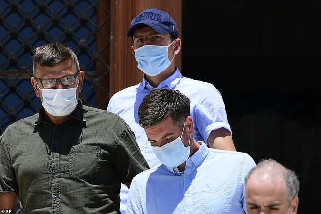 Maguire cùng luật sư rời tòa sau phiên điều trần tại Hy Lạp. Ảnh: GETTY IMAGES