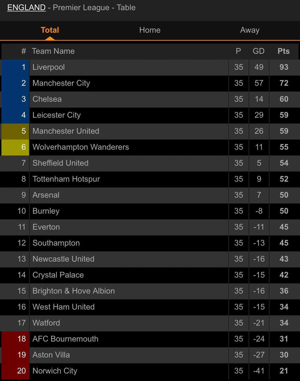 BXH Premier League:
