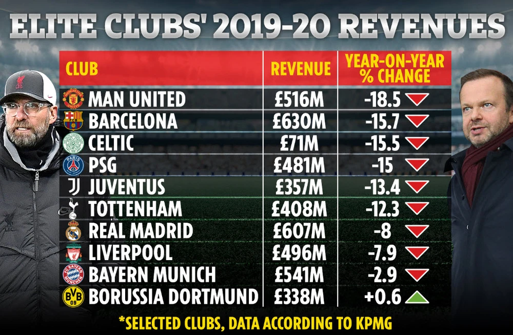 Trong mùa qua, MU có doanh thu tổng cộng 516 triệu bảng Anh, giảm đến 18,5% so với mùa giải trước (2018-2019). Barcelona có doanh thu giảm 15,7% so với cùng kỳ năm ngoái. Tuy nhiên, đội chủ sân Camp Nou là CLB có doanh thu cao nhất làng bóng đá thế giới với 630 triệu bảng Anh.