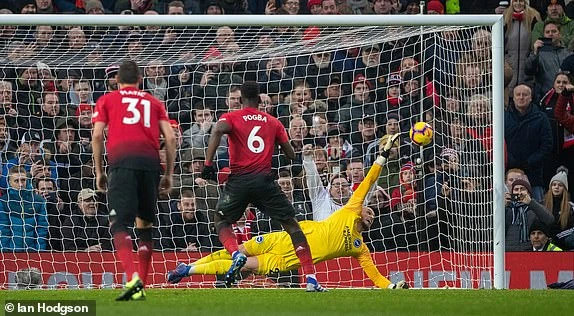 Phút 27, Pogba tự tin dứt điểm quyết đoán ghi bàn mở tỉ số 1-0 trên chấm 11m cho MU khi trước đó chính tiền vệ người Pháp bị đối phương phạm lỗi trong vòng cấm.