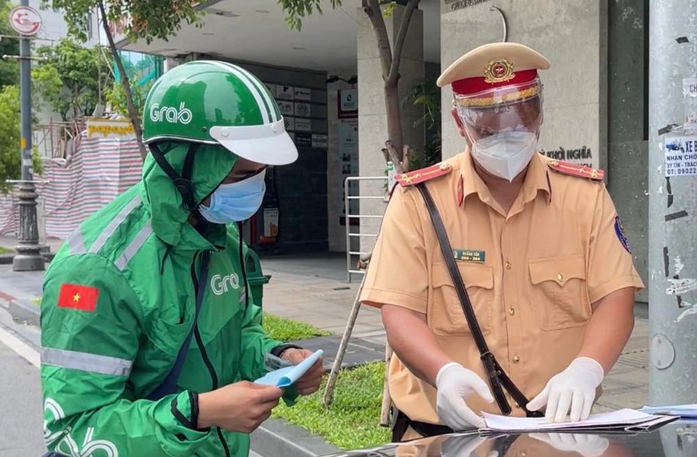 Sáng 25-7, hàng loạt shipper khi qua các chốt kiểm soát tại quận 3 đã bị Đội CSGT – TT Công an quận 3 kiểm tra giấy tờ và phát hiện một người không phải đối tác Grab nhưng mặc đồ Grab đi ra đường.