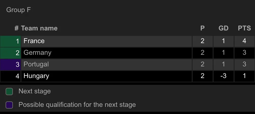 Kết thúc lượt trận thứ hai bảng F Euro 2020, tuyển Pháp đứng đầu bảng với 4 điểm, tuyển Đức nhì bảng và Bồ Đào Nha đứng vị trí thứ ba, Hungary xếp cuối có 1 điểm. Tại lượt đấu cuối, Bồ Đào Nha sẽ đá với Pháp và Đức sẽ đối đầu với Hungary, hai trận đấu sẽ diễn ra cùng giờ vào lúc 2h ngày 24-6.