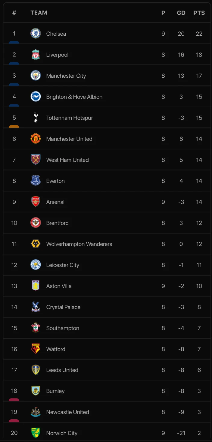Với chiến thắng tưng bừng trước Norwich City trên sân nhà, Chelsea tiếp tục duy trì ngôi đầu bảng với 22 điểm sau 9 vòng đấu. Ở cùng vòng đấu này, Arsenal giành chiến thắng với tỷ số 3-1 trên sân nhà Emirates trước đối thủ Aston Villa.