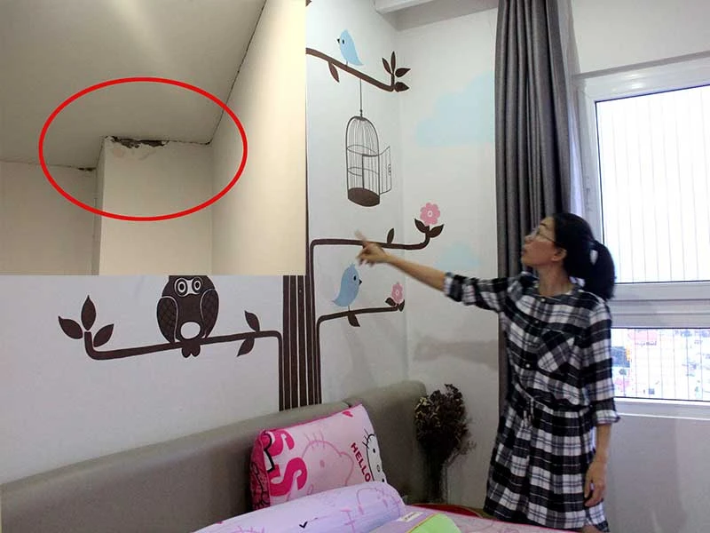 Theo bà Thy, từ lúc nhận nhà bà đã phát hiện các vết rạn tại khu vực tiếp giáp giữa tường và trần nhà. Thời gian gần đây, những vết nứt này ngày càng lớn. “Phía trên tầng 17 là sân thượng mà đã nứt như vậy thì ai dám đảm bảo khi xây xong tầng 18, gánh thêm hàng tấn bê tông nữa thì chất lượng, tuổi thọ căn hộ của tôi sẽ xuống cấp ra sao?”.