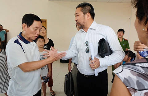 Cư dân chung cư The Rubyland vây lấy ông Đinh Hồng Hải, Chủ tịch HĐQT Công ty Tân Hoàng Thắng, chủ đầu tư dự án, sau cuộc họp ngày 31-7 để yêu cầu giải quyết giấy hồng cho cư dân. Ảnh: VIỆT HOA