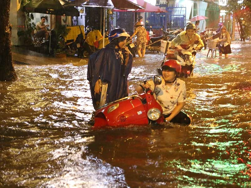 “Trời tối đen như mực, mưa như tát nước vào mặt, bốn bề ngập mênh mông. Mấy mẹ con vừa chạy xe vừa run như cầy sấy, cặp vở, người ngợm tả tơi”. Sau hơn một tiếng vật lộn trong cơn mưa để đón hai con đi học về, chị Liên (quận 7) hổn hển kể khi vừa bước vào nhà. Đó cũng là tình cảnh mà hàng chục ngàn người gặp phải trong cơn mưa lớn chiều tối 26-9.