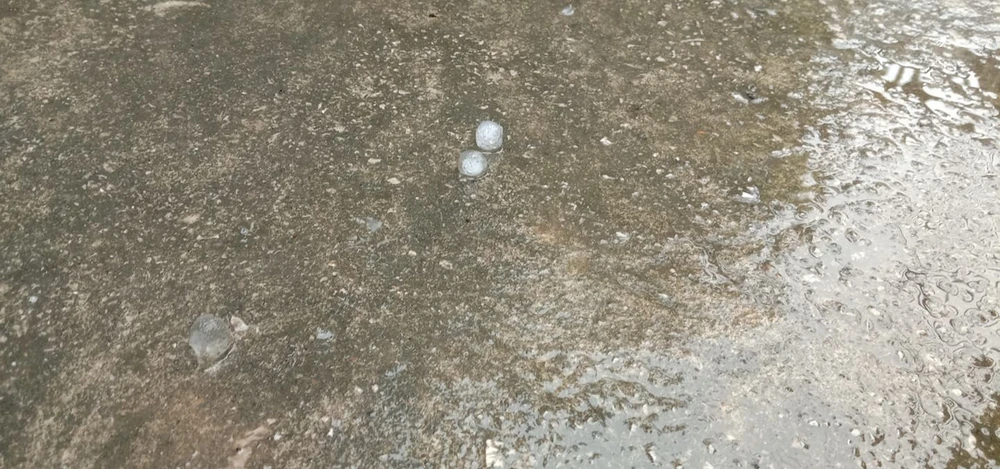 Những viên đá kích thước như hạt ngô rơi xuống nền sân gạch rồi văng tung tóe. Ảnh: H.ANH
