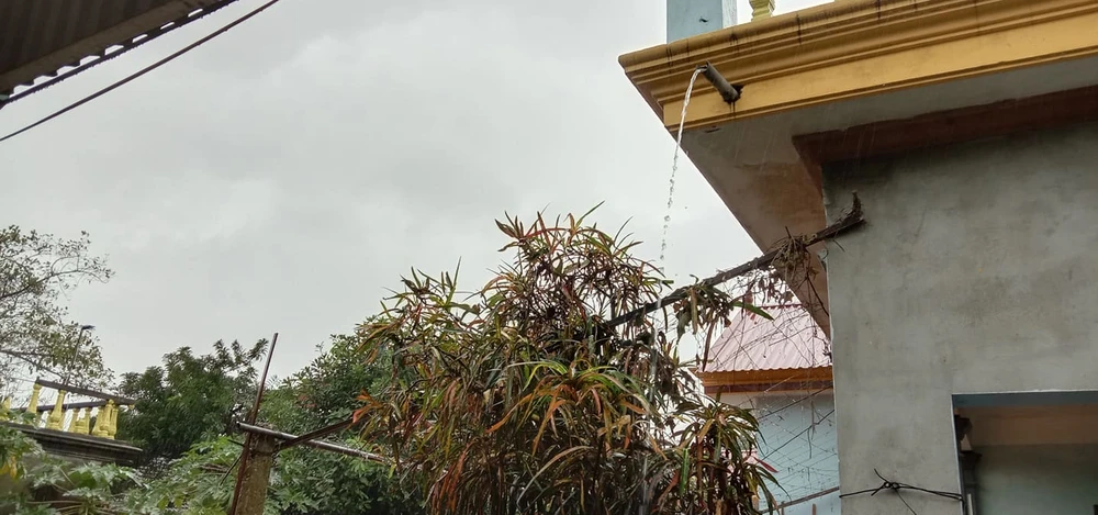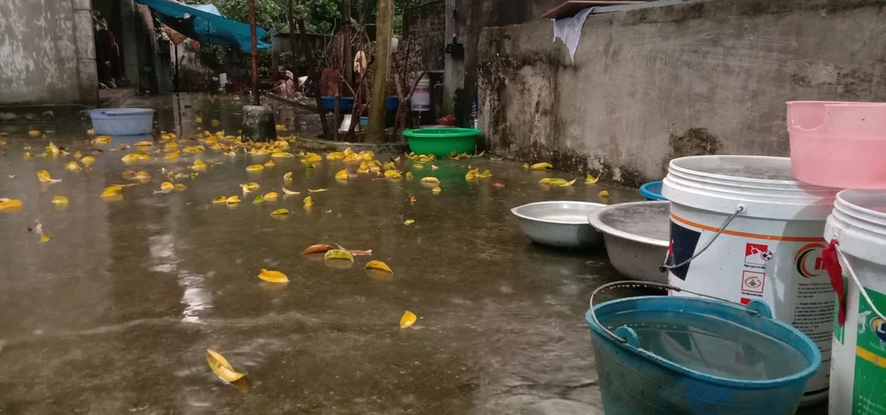 Máng xối của nhiều nhà liên tục xả vì lượng nước đổ xuống mỗi lúc một nhiều. Ảnh: H.ANH