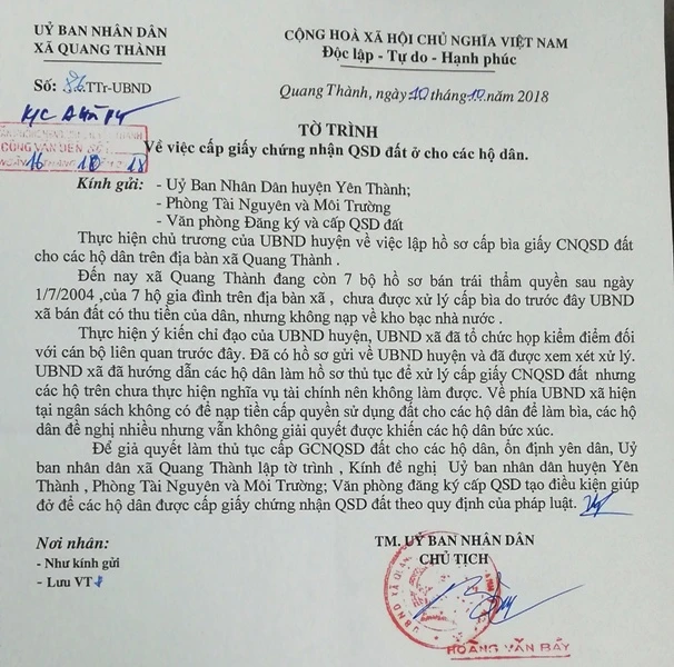 Người dân đã kiến nghị nhiều lần nhưng chưa giải quyết được khiến dân bức xúc. UBND xã Quang Thành lập tờ trình đề nghị UBND huyện Yên Thành và các phòng tạo điều kiện giúp đỡ để các hộ dân được cấp giấy đỏ.