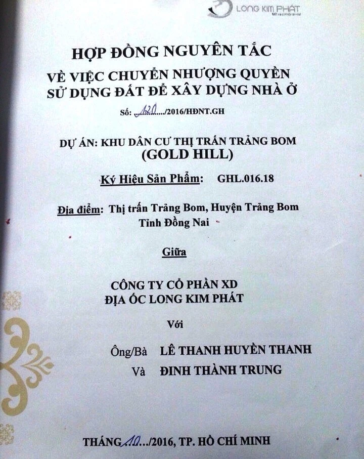 Theo đó, vợ chồng anh Trung ký với Công ty Long Kim Phát hợp đồng nguyên tắc về việc chuyển nhượng quyền sử dụng đất để xây dựng nhà ở tại dự án khu dân cư thị trấn Trảng Bom (Gold Hill). Ký hiệu sản phẩm là GHL.018 – 16. Số hợp đồng là 120/HĐNT.GH.