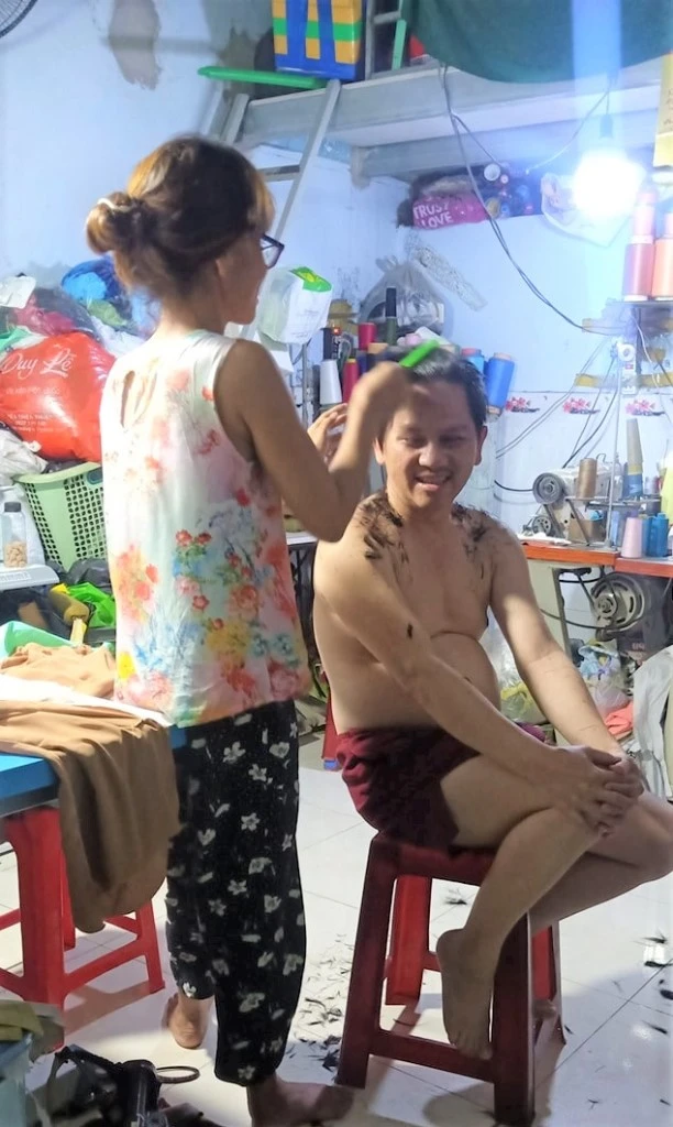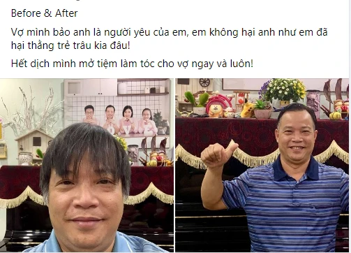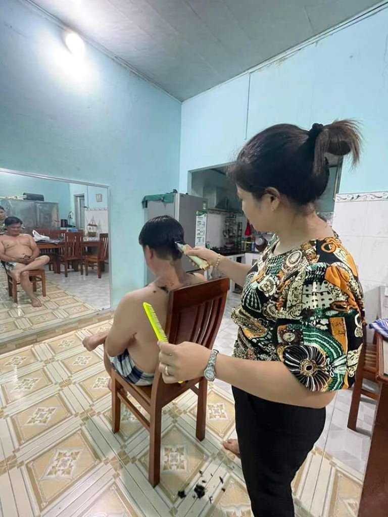 Cô Hồng Lẩm (Bình Dương) cho biết, một tháng rưỡi nay vì không có cửa tiệm cắt tóc nào mở nên chú Khánh (chồng cô) không đi cắt tóc được. Vì tóc dài quá rồi nên chú nhờ cô cắt luôn. Cô Lẩm kể thêm: "Đó giờ tôi có cắt tóc cho ai bao giờ đâu, nay chồng tôi tóc tai lổm chổm nên ổng nhờ tôi cắt giùm thì tôi mạnh dạn cắt luôn".