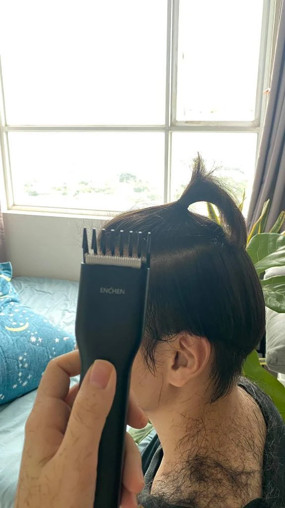 Anh Hải được em gái cắt tóc cho mình bằng tông đơ mua trên mạng. Ảnh: NVCC