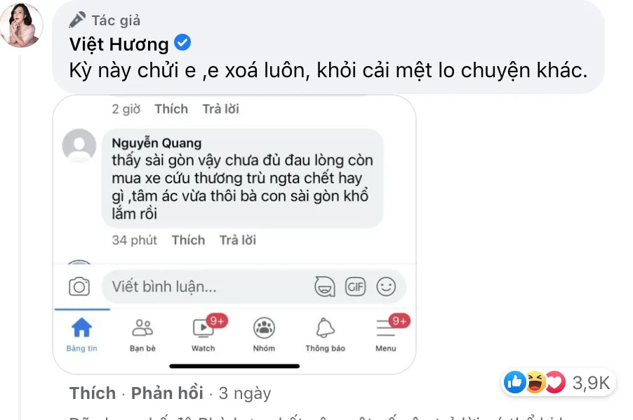 Nghệ sĩ Việt Hương đã phải thốt lên rằng: “Đăng bị nói, không đăng cũng nói, mua chiếc xe bị rày 3 tháng”. Cụ thể, ngày chị đi kiếm xe, có người nói không đặt cọc chắc không mua, nói cho vui. Ngày chị cọc xong, đăng lên, lại có người bình luận: “Khoe khoang, chờ xe về rồi nói”.