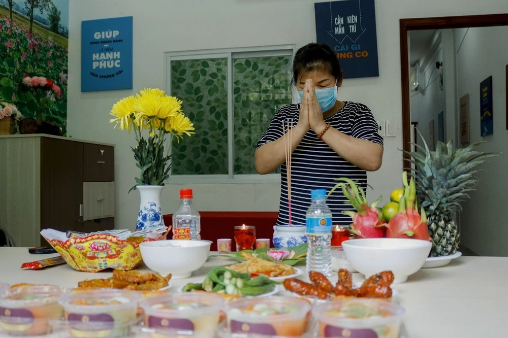 Đây là lần thứ 3, nhà bà Phạm Thị Hằng (TP.Thủ Đức, TP.HCM) đặt dịch vụ mâm cúng trong dịp lễ. Bà cho biết: "Có những khi tôi không biết cách bày mâm, cũng như nghi thức vái cúng, nhờ có nhân viên hướng dẫn nên tôi thấy dễ dàng hơn".