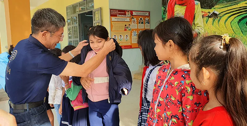 Đoàn thiện nguyện đã vượt qua nhiều đoạn đường rừng, đến tận nơi, trao tận tay các em học sinh những chiếc áo ấm. Các em rất vui mừng, hớn hở khi được các nhà hảo tâm, các nhà báo giúp mặc lên người những chiếc áo ấm mới.