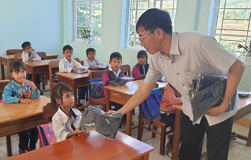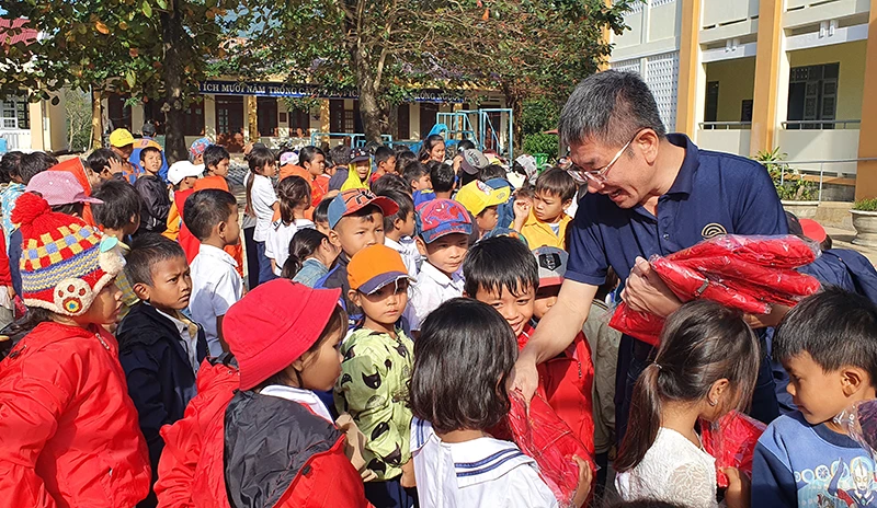 Trao tặng áo ấm cho học sinh Trường tiểu học Đa Lộc. Ảnh: TẤN LỘC