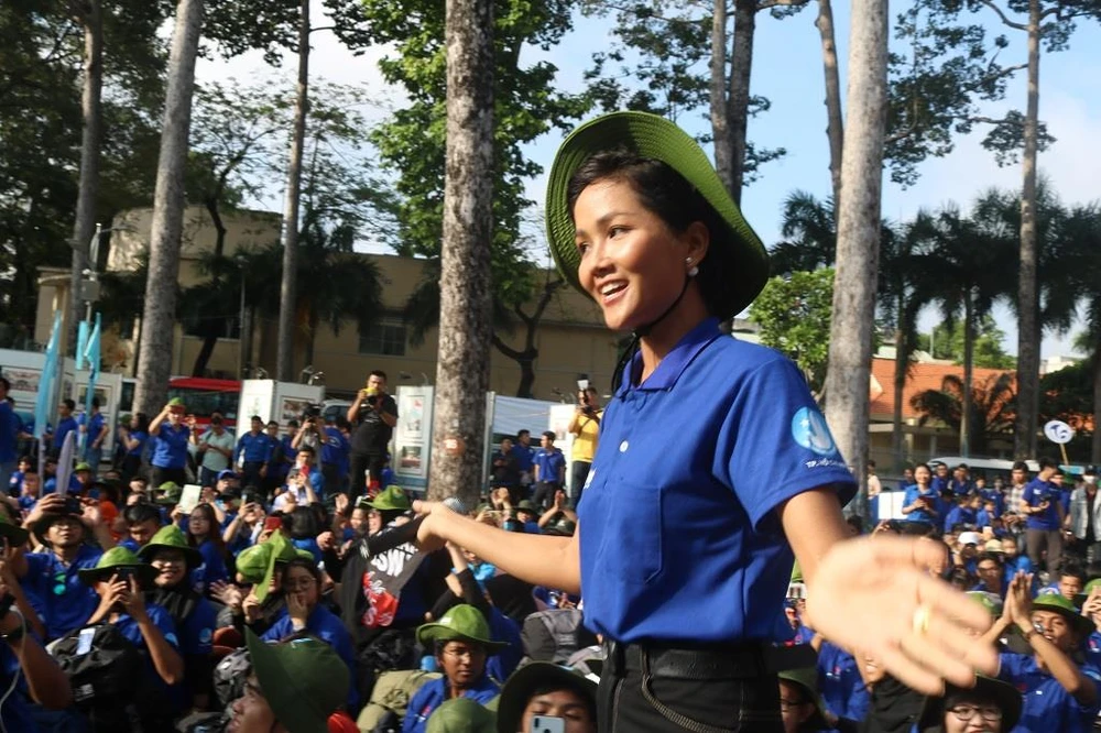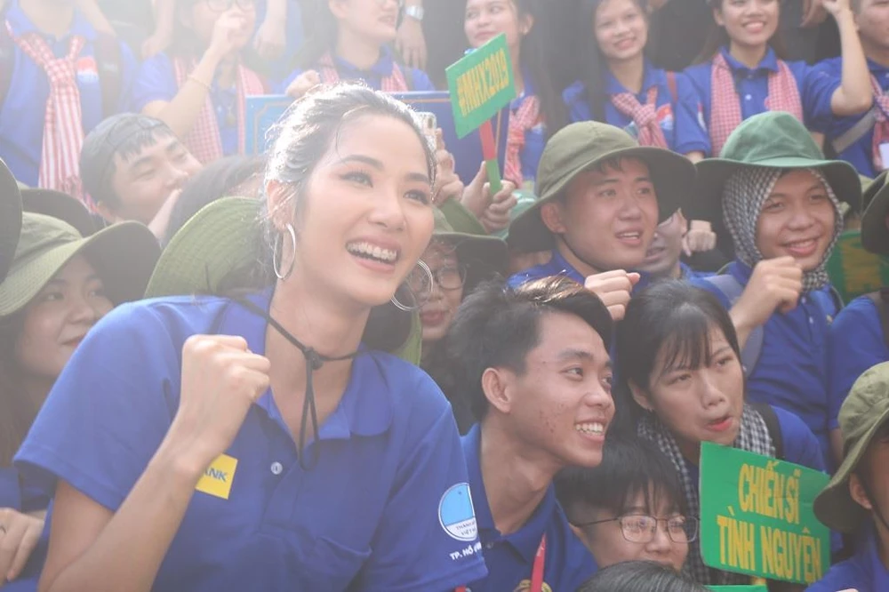 Hoa hậu H’Hen Niê hòa nhịp bài hát truyền thống “Mùa hè xanh” cùng các chiến sĩ tình nguyện.