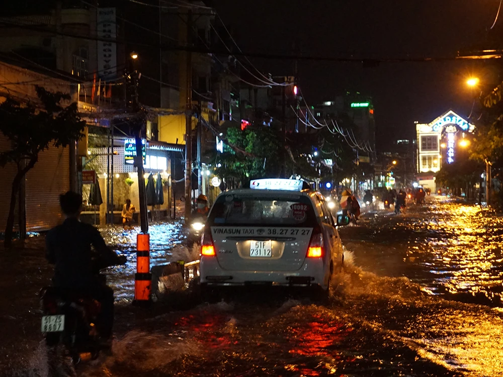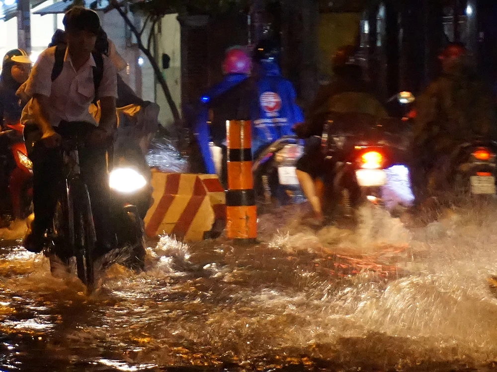 Trận mưa kéo dài vài chục phút đổ xuống nhiều địa bàn quận/huyện tại TP.HCM khiến các tuyến đường ngập nặng.