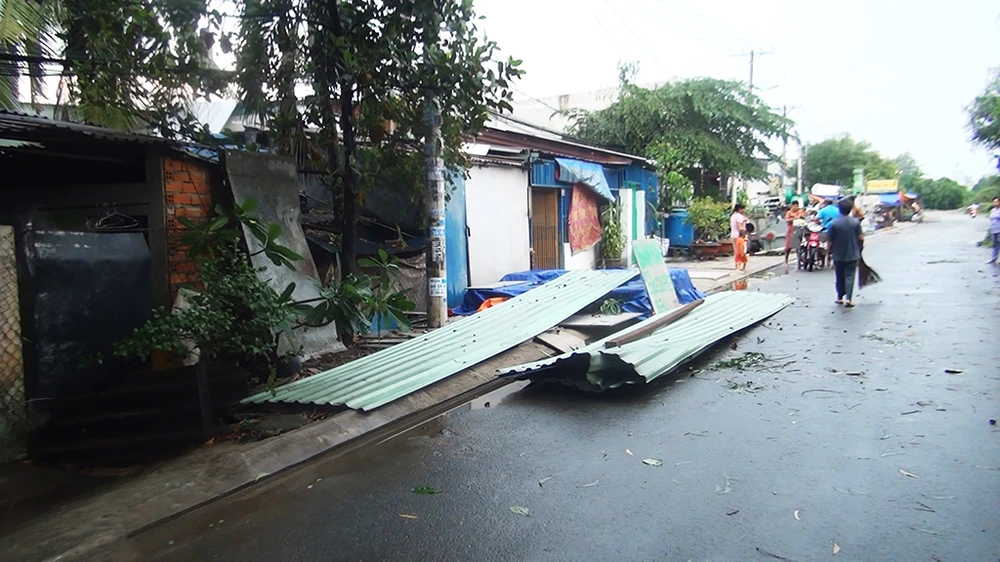 Tại đường Nguyễn Đình Kiên (phường Tân Tạo A, quận Bình Tân), gió lốc mạnh cuốn mái tôn của nhà dân bay khắp nơi hàng chục mét.