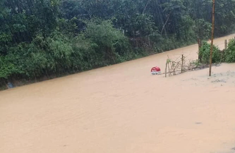 Đường Hồ Chí Minh qua xã Khai Sơn (huyện Anh Sơn, Nghệ An) bị ngập sâu. Ảnh: VÕ NGUYỆT.
