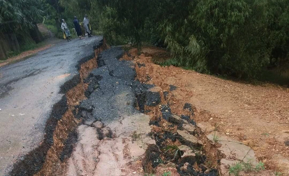 Đoạn đường qua xóm Nam Thượng, xã Ngọc Sơn (huyện Thanh Chương, Nghệ An) bị mưa lũ phá hỏng. Ảnh: DN.