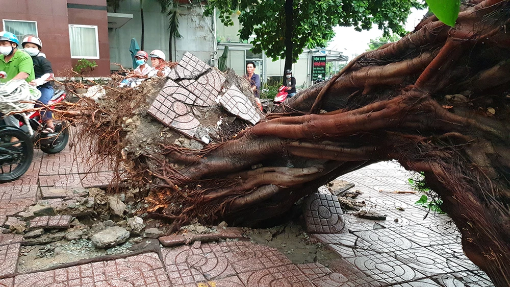 Cây trên đường Tân Sơn Nhì, quận Tân Phú bật gốc. Ảnh: NGUYỄN CHÂU