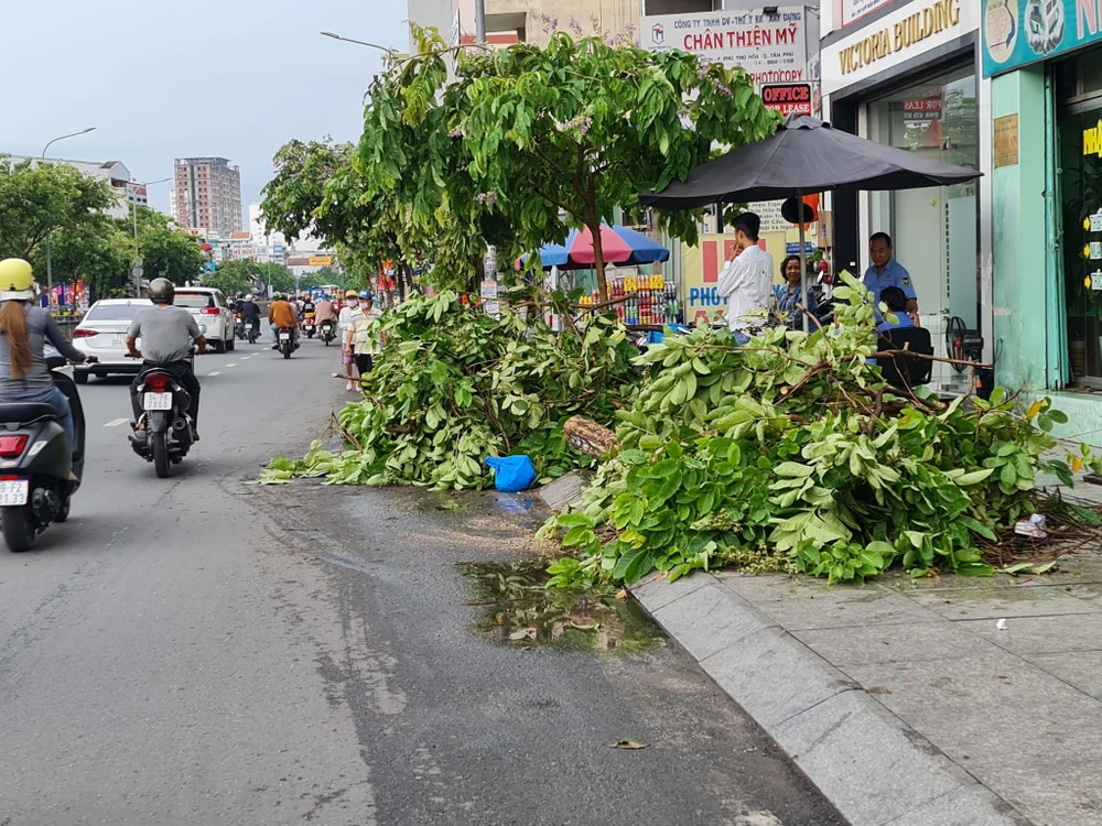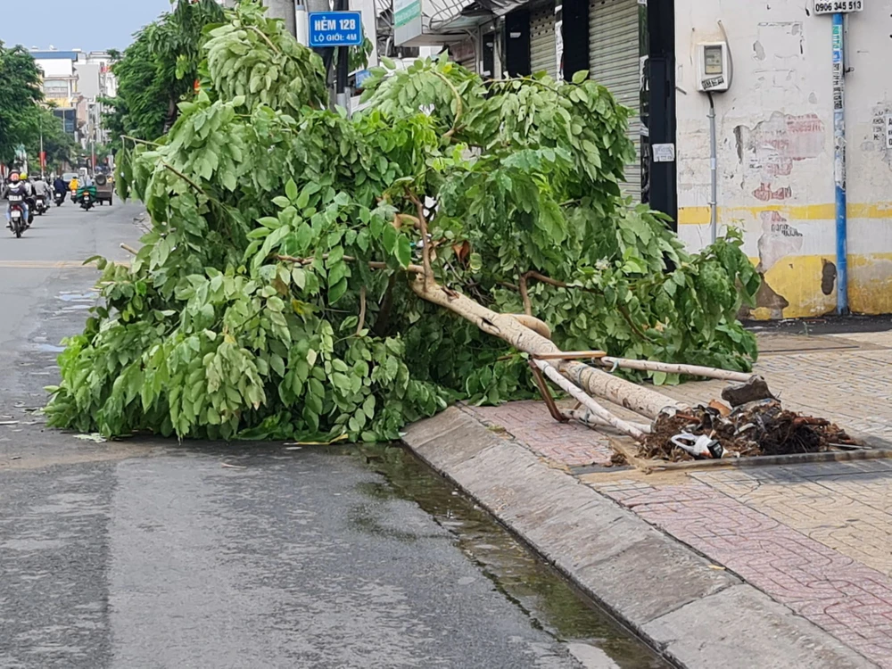 Trong sáng cùng ngày, mưa to gió lớn cũng khiến nhiều cây xanh trên địa bàn TP.HCM bị bật gốc, tét nhánh. Ảnh NT