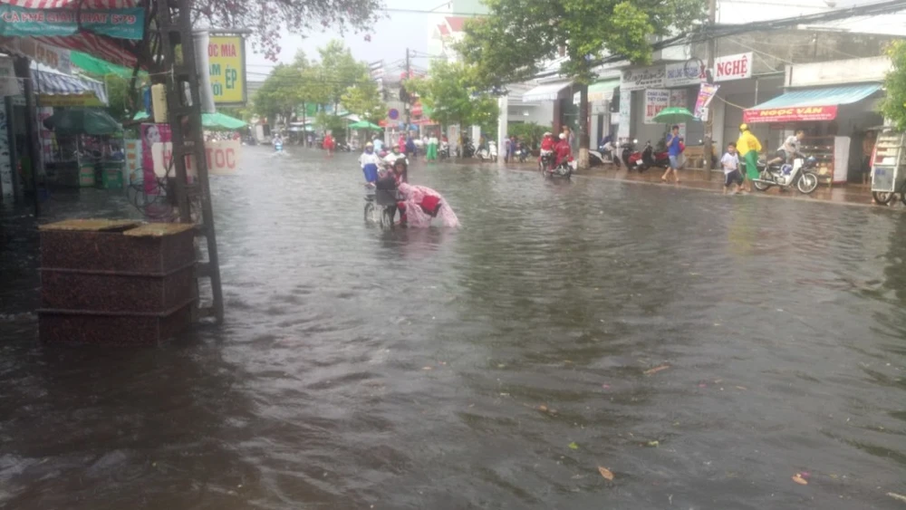 Nước tràn lên vỉa hè ở đường Trần Quang Diệu. Ảnh: NN