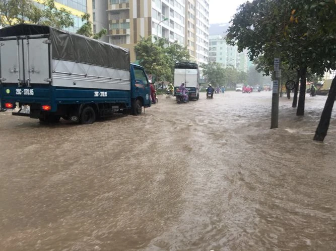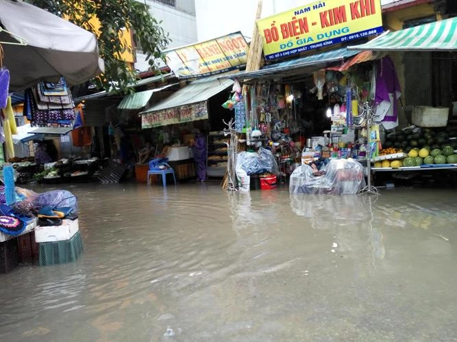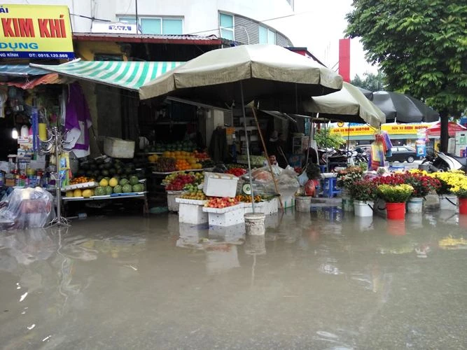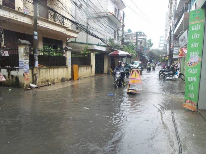 Tại phố Quan Nhân, nước ngập sâu đến hàng nửa mét khiến người dân di chuyển rất khó khăn, nhiều xe bị chết máy giữa chừng khi cố gắng điều khiển vượt qua điểm ngập. Phố Hoàng Minh Giám nối với Trần Duy Hưng bị ngập nặng. Ảnh: Bách Trần
