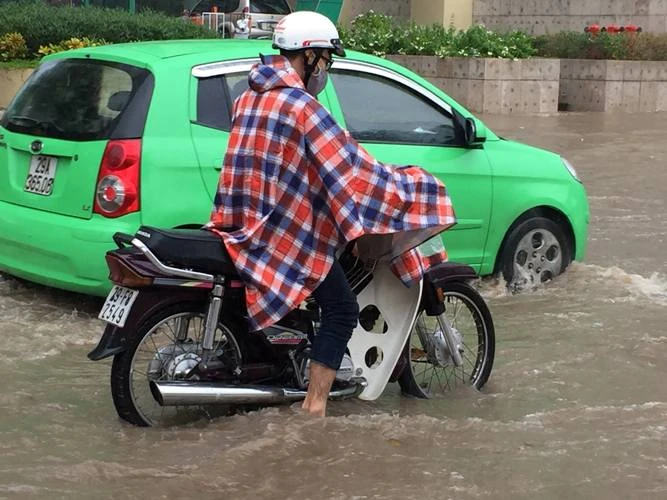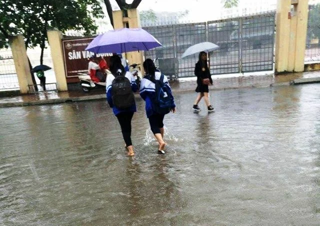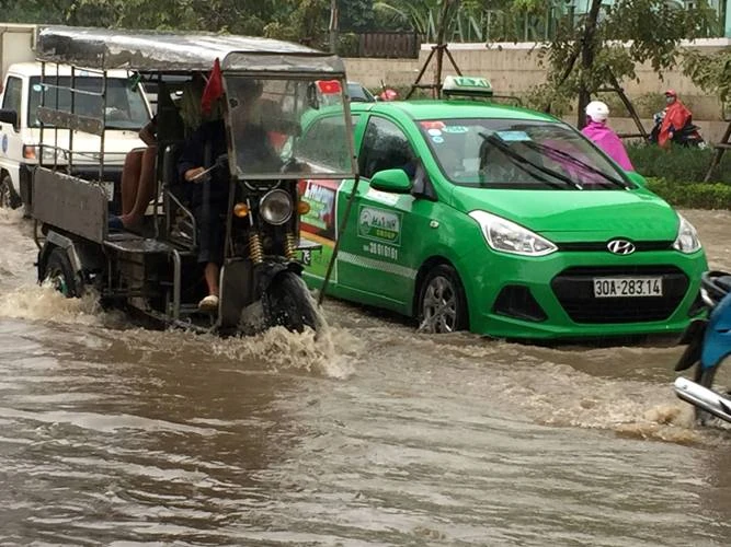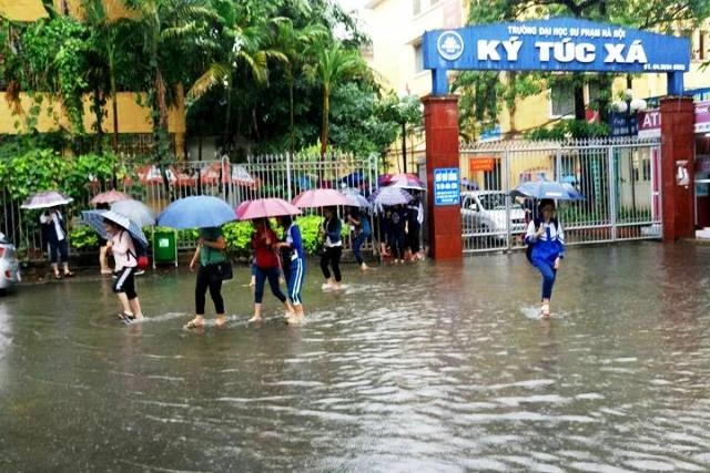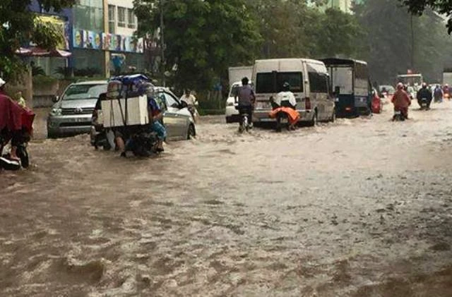 Mưa lớn kéo dài, hàng loạt tuyến đường ở thủ đô bị ngập nặng, cụ thể là phố Đội Cấn, Liễu Giai, Quan Nhân, Hoàng Minh Giám, Phạm Văn Đồng, Hoàng Quốc Việt, Vũ Trọng Phụng, Nguyễn Huỳnh Thúc Kháng... Một người dân cố gắng đội mưa thoát ra khỏi phố Quan Nhân. Ảnh: otofun