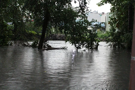 Nước kênh Hy Vọng dâng lên cao bằng với mặt đường gây nguy hiểm cho người dân.