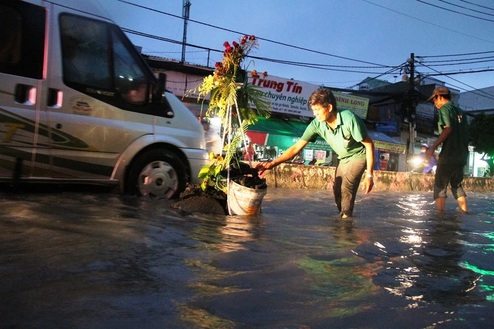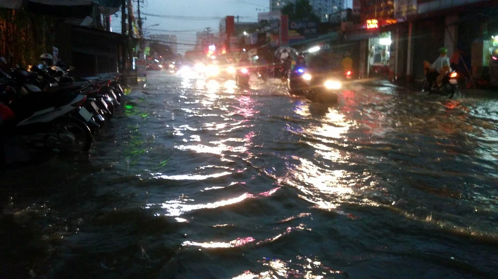 Khu vực quận Bình Thạnh mưa không lớn, vũ lượng ở trạm cầu Bông chỉ 28,5 mm nhưng tuyến đường Nguyễn Hữu Cảnh nước vẫn ngập sâu, gây trở ngại giao thông.