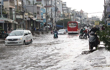 Tại đường Lò Gốm (quận 6) nước ngập sâu gần nửa mét khiến nhiều xe máy khi lưu thông qua đây bị chết máy phải dẫn bộ. Do đường ngập nước cộng với đường xấu, đá lởm chởm nên nhiều người cố chạy qua khu vực này đã bị ngã.