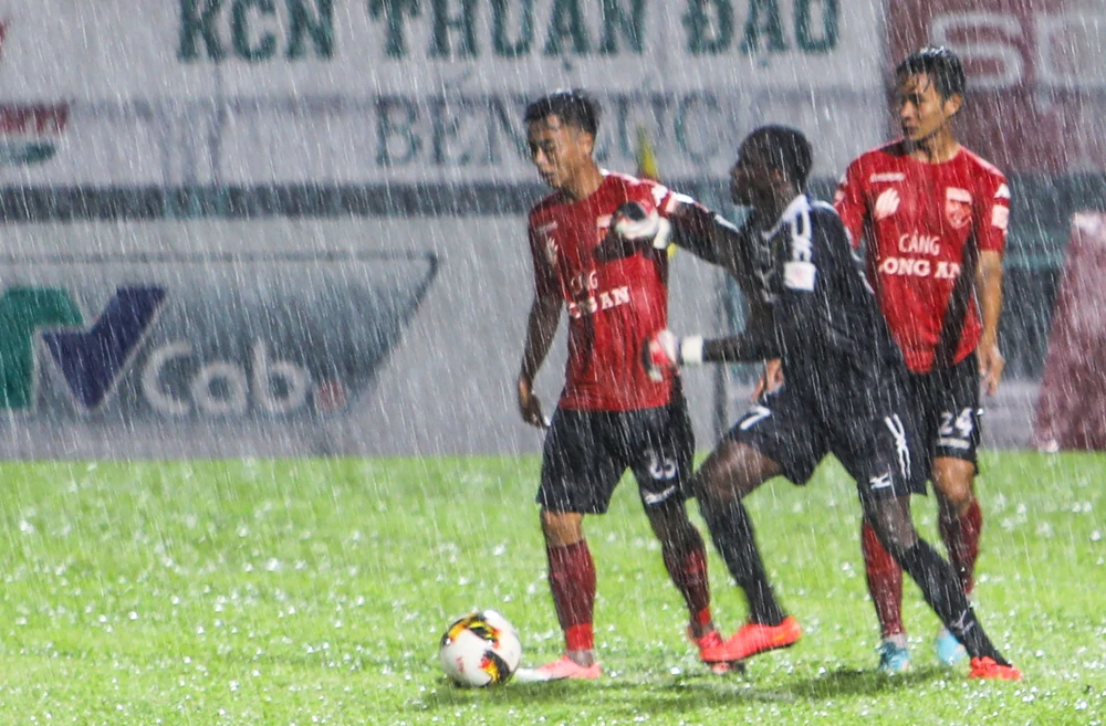 “Thủy chiến” trong điều kiện nước ngập sân quá sâu nên trận đấu rất khó khăn cho hai đội. Đến phút bù giờ áp chót (90+4) thì Đức Thịnh rút ngắn 2-3 cho Long An. Thịnh vào lưới nhặt bóng vội chạy lên giữa sân, tranh thủ thời gian để “kiếm thêm” bàn thắng song bất thành.