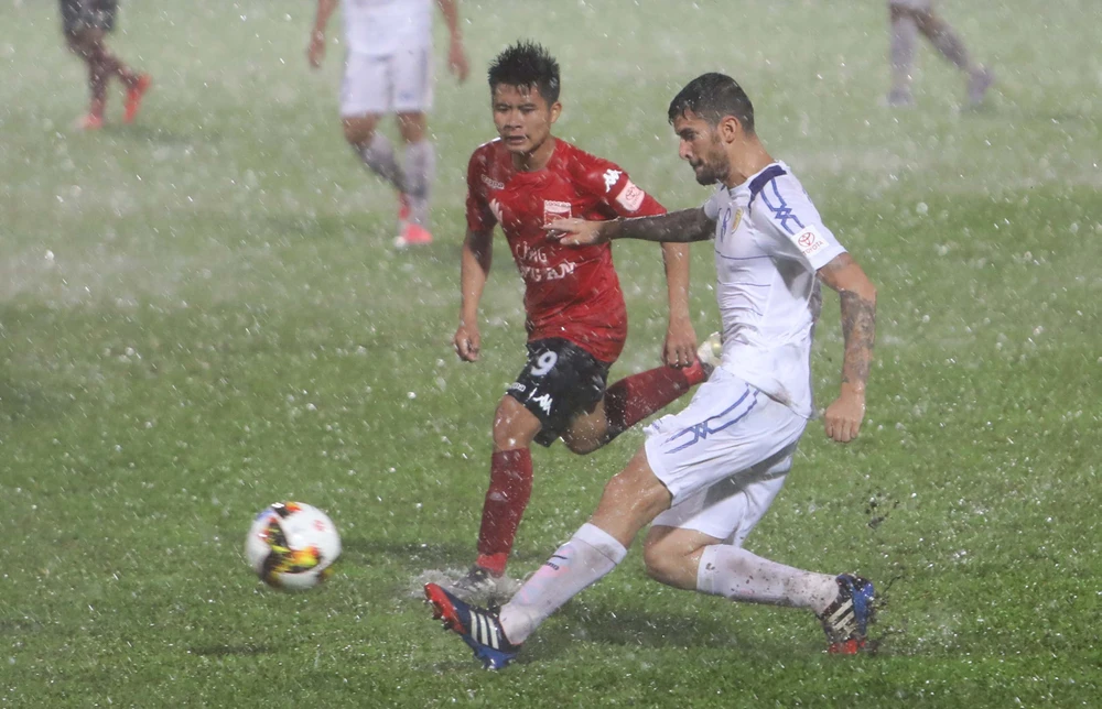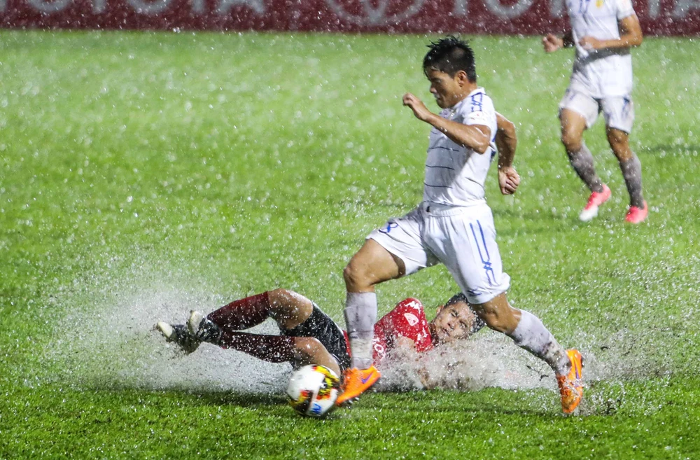 Phút 48, thủ môn Quốc Cường bắt bóng không dính do bóng ướt nước, trơn để bóng tuột ra và Đặng Văn Robert có mặt kịp thời đệm vào nâng tỉ số lên 2-1 cho đội khách TP.HCM. Sân sũng nước quá… sâu khiến hai đội chủ yếu sút, “dích” bóng và chạy để bớt lực cản của nước.