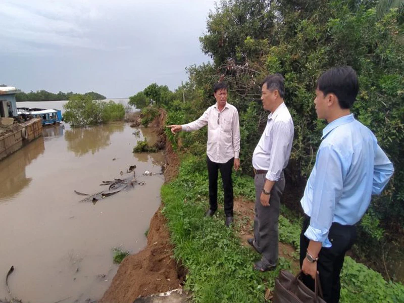 Theo đó, điểm sạt lở xuất hiện tại con đê ven sông Tiền thuộc cồn Tam Hiệp, ấp 4, xã Tam Hiệp, huyện Bình Đại. Trước đó, tuyến đê này đã xuất hiện vết nứt. Những ngày qua do mưa lớn cùng triều cường đã làm sạt lở đoạn đê trên sâu vào 2 m.