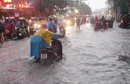 Nước ngập trên đường Ung Văn Khiêm (quận Bình Thạnh) chiều 6-9. Ảnh: MINH QUÝ
