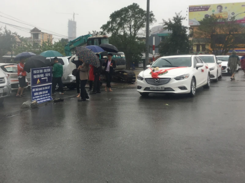Một đoàn rước dâu không thể di chuyển bằng xe vì đường bị ngập. Ảnh: NGUYỄN DO