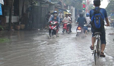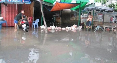 Trước cửa nhà dân chắn bao cao nhưng vẫn bị ngập sâu. Ảnh chụp trên đường 3-2. Ảnh: N.NAM