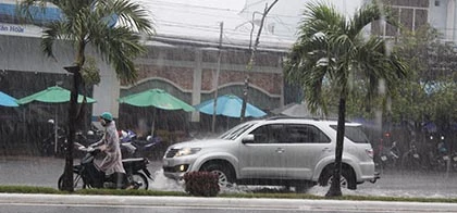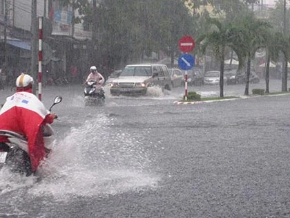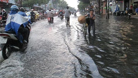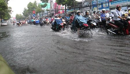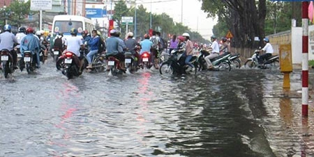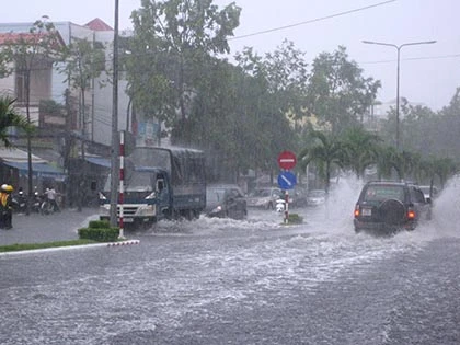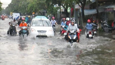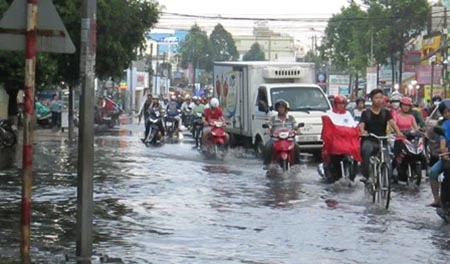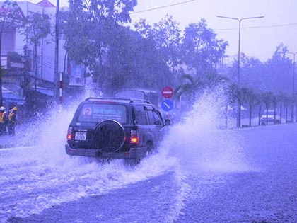 Đường Trần Hưng Đạo đoạn từ Bệnh viện Nhi Đồng đến ngã tư giao cắt với đường Mậu Thân ngập sâu như sông. N.NAM