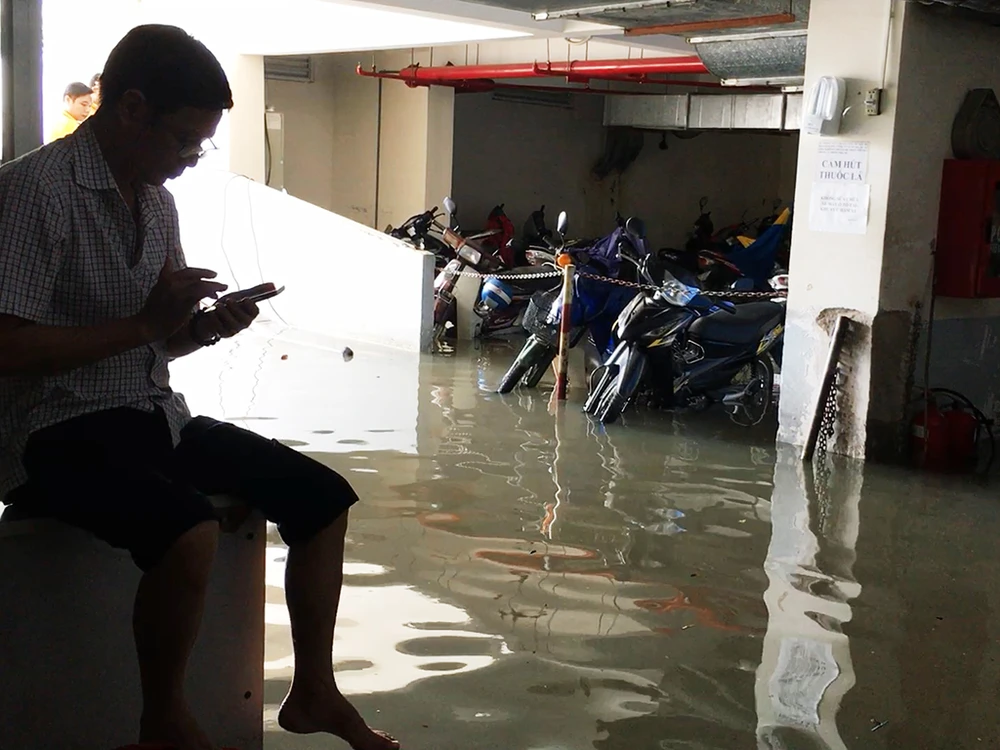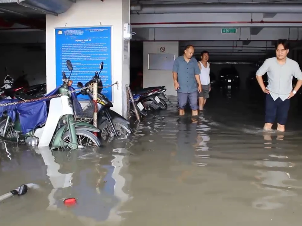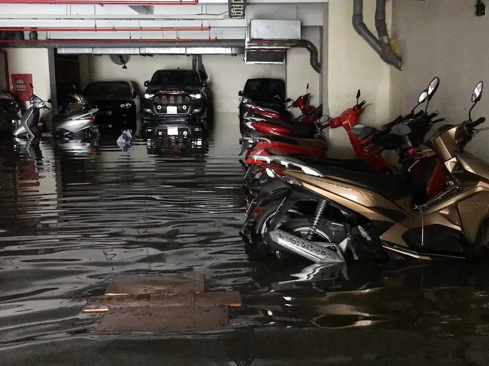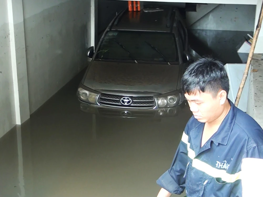 Nước lớn đổ vào chung cư, trường học và nhà dân khiến nhiều hầm để xe bị ngập.