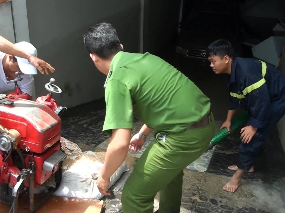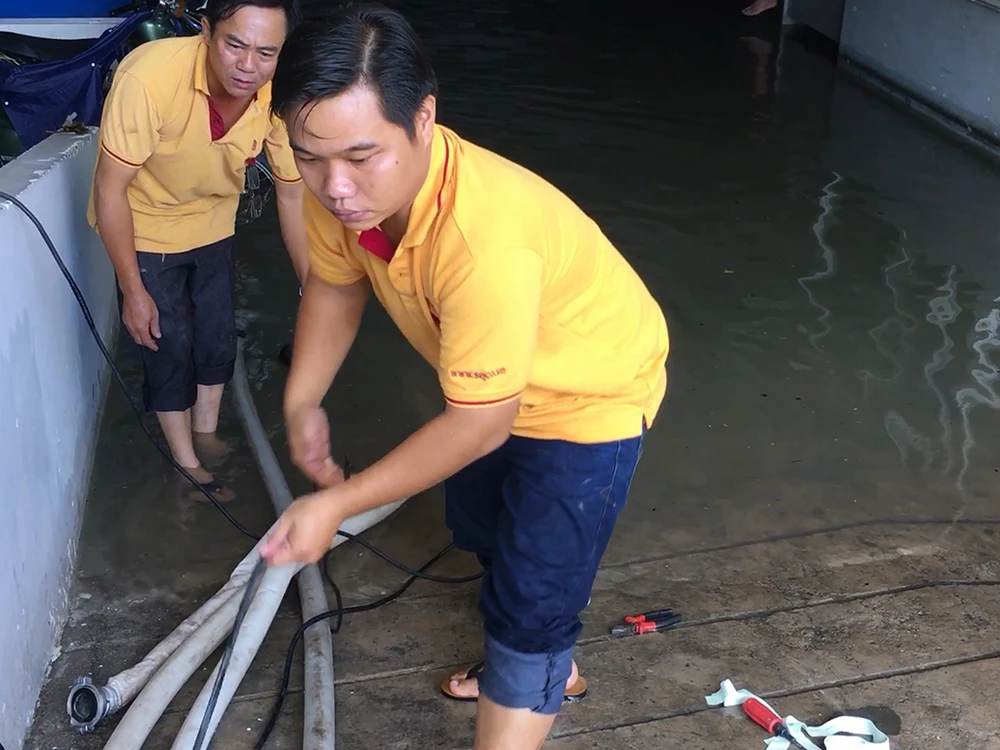 Lực lượng tại chỗ của chung cư cũng cố gắng bơm nước ra ngoài.