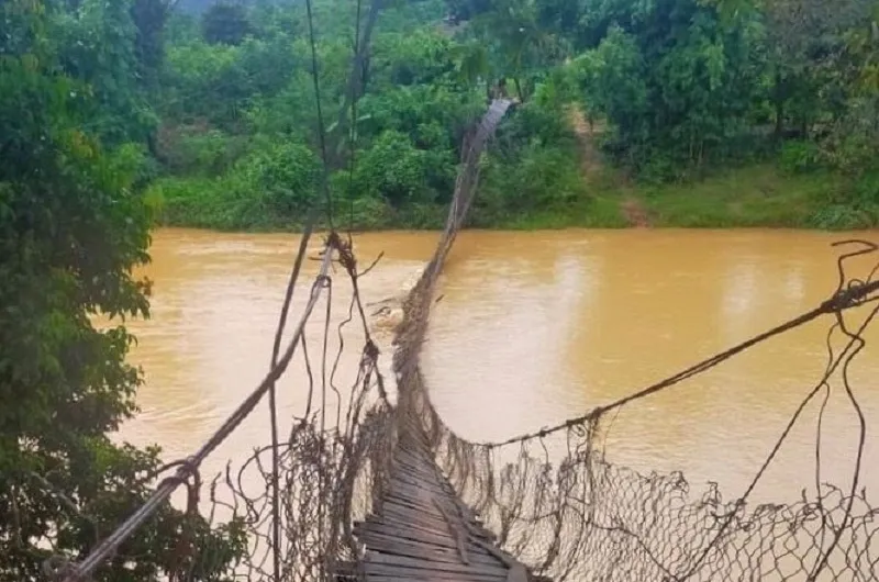 Theo đó, do mực nước chảy siết nên cầu bị sập vào tối hôm qua (7-10). Nước lớn chảy xiết đã cuốn trôi nhiều ván sàn trên cầu, bốn trụ néo hai bên cây cầu cũng bị nhổ bật, người dân không thể đi lại được.