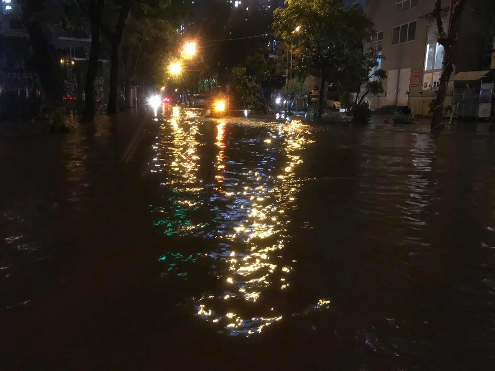 Tối 11-5, sau gần một ngày nắng gắt, Hà Nội đón cơn mưa lớn. Tại một số khu vực, nhiều tuyến phố nhanh chóng bị ngập nước, khiến giao thông gặp khó khăn.