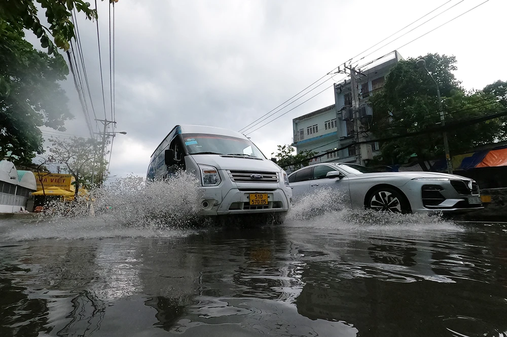 Trên đường Nguyễn Văn Quá, nước ngập cục bộ khiến các phương tiện di chuyển khó khăn. Ảnh: NT