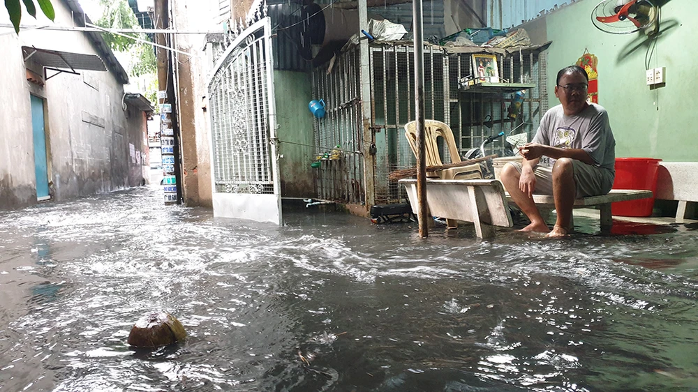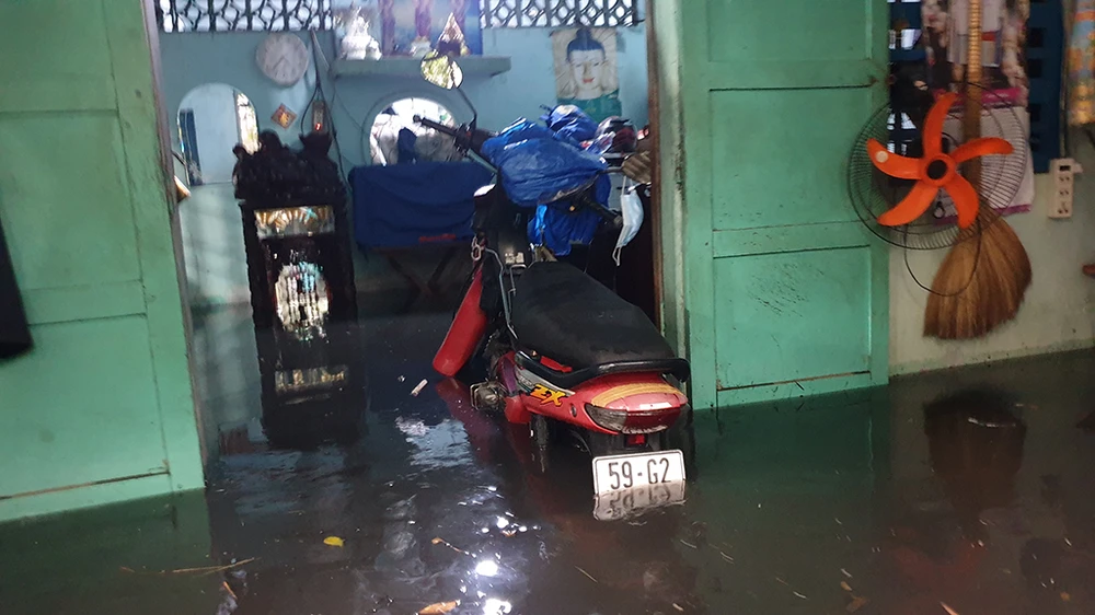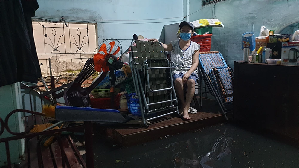 Nước cống chảy tràn vào nhà ông Phạm Văn Tước (phường Đông Hưng Thuận, quận 12). Ảnh: NT