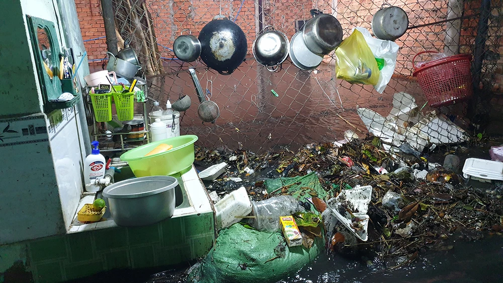 Nước cống kèm rác thải vướng đầy nhà, bốc mùi khó chịu. Ảnh: NT