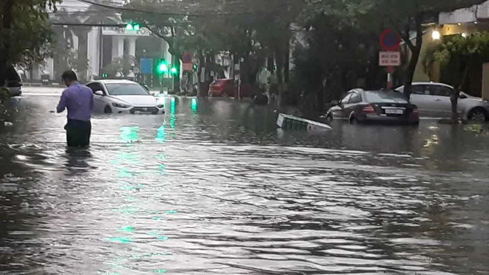 Ghi nhận của chúng tôi, nhiều tuyến đường trung tâm Đà Nẵng như Nguyễn Văn Linh, Lê Duẩn, Hàm Nghi, Lý Tự Trọng… ngập trong nước. Có nơi nước ngập đến nửa mét, nhấn chìm nhiều ô tô của người dân để ngoài đường.