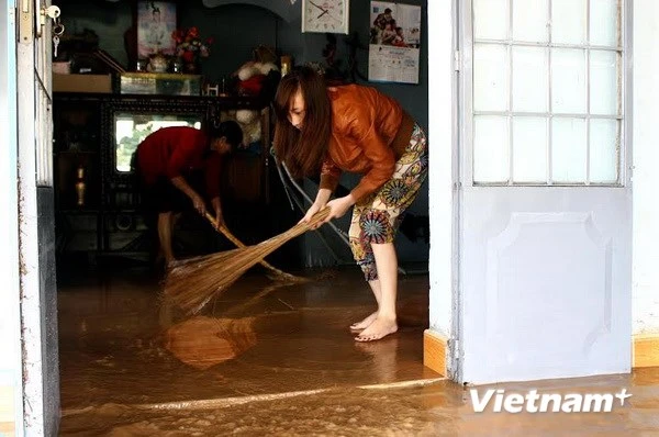 Người dân thôn Định An (Hiệp An) dọn dẹp nhà cửa sau trận lũ.